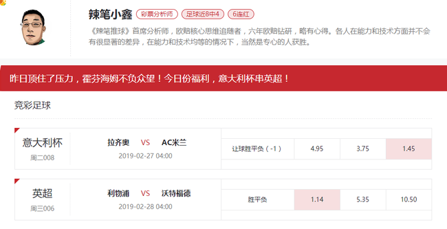 本届意大利杯半决赛采用主客场双循环制,两队次回合较量将在4月24日展开。拉齐奥在上周中有欧战任务,周末的联赛被延期,球队在体能方面有一定优势,不过4天之后还将与罗马在联赛中相遇,近期频遭恶战,主帅西蒙尼·因扎吉在人员伤停较为情况下或会有所取舍。主流公司开出的初始指数为拉齐奥让0/0.5球中低水,与往期相当,即时水位升至超高(截至13时)。鉴于AC米兰近期状态和阵容完整性明显占优,同时蓝鹰近4次主场面对AC米兰时优势并不十分明显(1胜3平)的情况,AC米兰易走热,但又不能降盘,否则AC不仅会更热,而且赔付会更大。综上所述,本场看好AC米兰不败,推荐拉齐奥-1球负。