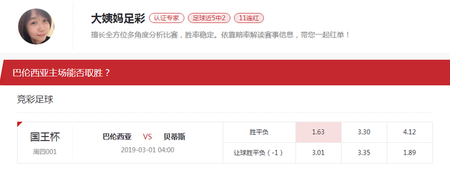 17-18赛季,半决赛巴伦西亚输给巴萨;16-17赛季第五轮都没过;15-16赛季巴伦西亚还是输给巴萨;14-15赛季同样是第五轮都没过。18-19赛季,如今巴伦西亚已经进入半决赛,对手是在国王杯中战绩非常一般的贝蒂斯,能不能和巴萨会师决赛,这场球对巴伦西亚很重要。而贝蒂斯如果赢球,那么将是04-05赛季之后又一次进入到国王杯决赛,04-05赛季最终贝蒂斯在主场1-1战平情况下,加时赛2-1战胜奥萨苏纳,最终成功夺冠。相对来说,贝蒂斯对这个国王杯的渴望要大于巴伦西亚。首回合在贝蒂斯主场,双方战成2-2平,巴伦西亚拿到了2个客场进球,如今回到主场,主场一向强势的巴伦西亚,本场比赛肯定不会手软,相对来讲,皇家贝蒂斯并非没有拉力,他们本赛季的球风美轮美奂,场面极具观赏性,不乏击败巴萨、马竞的经典战役,但球队近期三线作战略显疲惫,上周末联赛虽然轮换了洛赛尔索、、巴尔特拉、华金、瓜尔达多等主力,体能状态也并非最佳,再加上本赛季国王杯决赛是在其主场进行,渴望胜利的他们必然会采取激进打法,后场将会留下不少空挡被对手利用。数据层面,本场巴伦西亚仍然获得支持,他们赢指的难度明显要大于对手,然而他们的平局率过高无疑会让支持者有所顾忌,两队实力层面差距并不大,看好巴伦西亚主场小胜!