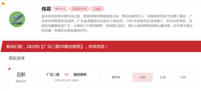 [新浪球通]伟哥竞彩推荐:广岛三箭VS磐田喜悦