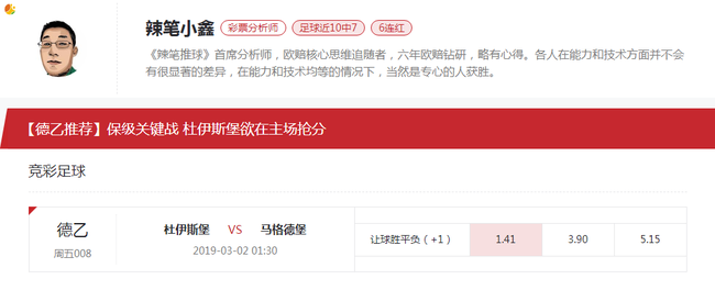 马格德堡近期表现非常出色,近5轮联赛取得3胜2平的战绩,其中2场客战全部取胜。虽然马格德堡目前以38粒丢球排在德乙防守第三差的位置,但是近5轮联赛只丢了3球,可见他们战绩提升很大原因在于防守。主力中场蒂皮茨近期发挥出色,近4场比赛打进3球送出1次助攻,另一名前锋贝克目前是球队射手王,一共打进8球,他们两人一共为马格德堡在联赛中打进了14球,占到全队进球数的一半。