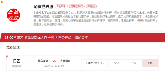 德岛漩涡上轮联赛主场面对FC岐阜,球队也是以1比0的比分战胜对手,新赛季目前2战1胜1负,大宫松鼠新赛季目前2战1平1负。基本面打法方面,中场控制方面两队相当,都有不错的传递配合掌控中场的能力,而且中前场也都有连续的攻势,不过相对主队进攻层次感更强,而且直塞配合渗透禁区的能力也是在客队之上,只是相对连续抢点冲击力还是客队占据上风,基本面还是比较接近。盘赔方面,结合两队状态和历史交锋盘赔,平半盘的开盘还是比较合理,不过高水的水位还是对上盘打出信心不足,之后整体水位变化不大,两队状态方面还是主队占优,其上轮主场也是赢球,加上两队近几次交锋上也是主队占据上风,相对本场整体上下盘吸收受注的能力也是主队更盛,但后续仍未对其打出给予持续支撑,上盘打出不易,故本场走下盘客队不败,竞彩让球胜平负主让一球选负。