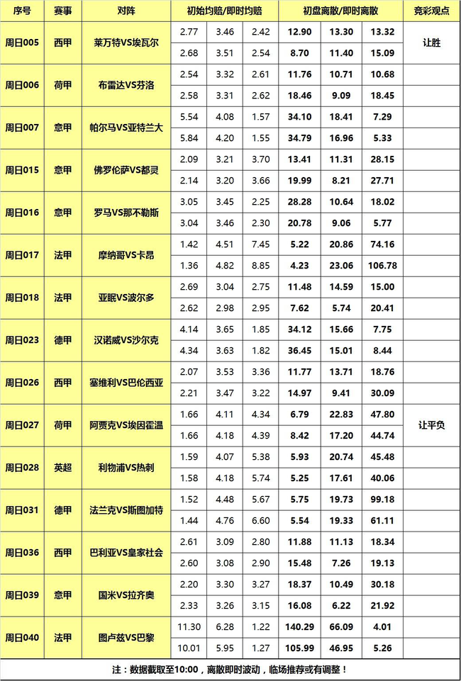 [关于离散] 竞技体育分析指数,也就是各家欧指分歧度。基本原理:百家欧指平均值与每家指数差值的绝对值的求和。离散度小则各家观点接近,进而赛果易打出;离散度大反之意见分歧大,赛果不易打出。又因各方因素影响下指数变动,离散在特殊时刻具有更高参考价值,切勿盲目参考运用。换句话说,离散只是参考指数,而非结论性数据!以下是各场数据汇总(数据截取至11:00):