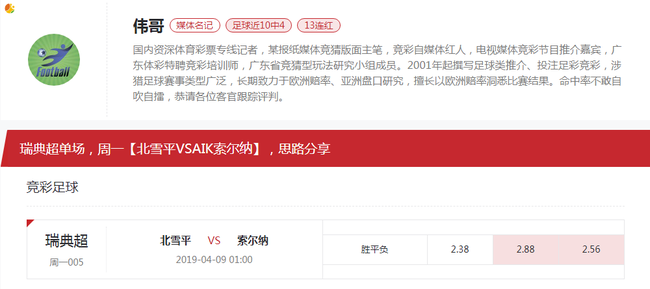 [新浪球通]伟哥竞彩推荐:北雪平VS索尔纳