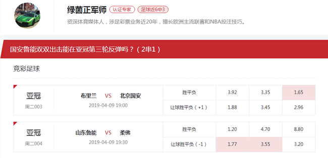 布里兰(武里南联)在主场的战斗力近几个赛季颇让外界震惊,本赛季首场亚冠他们也在主场爆冷击败了韩国的全北现代,对于亚冠舞台上成绩远不如全北的国安来说,现在竞彩3.92-3.35-1.65的赔率组合可谓对国安极度看好了。