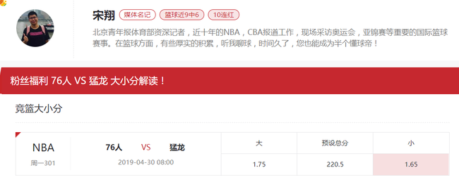 所以,本场猛龙全队的得分不一定会比上一场高。 76人方面就更糟糕了,全队虽然有6人得分上双,但整场比赛也一共只拿到95分,而且还是在雷迪克下半场飙中5记三分的情况下打出来的,整体的投篮命中率只有39.3%,指望76人在季后赛这种这么高强度的比赛中将投篮命中率有一个质的提升不太现实,所以当前220.5分的大小分盘口,个人更看好小分。