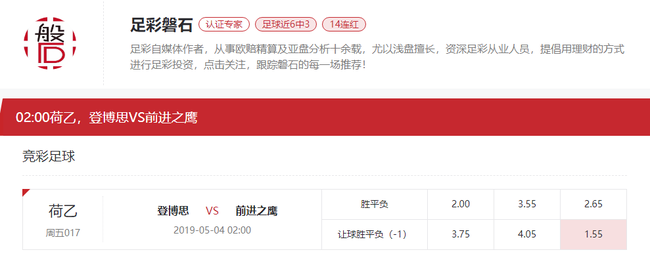分析:登博思上赛季荷乙联赛排名积分榜第11名,本赛季荷乙联赛17胜9平11负积60分暂列积分榜第6名,上场联赛客场2:0战胜罗达JC,终结了此前联赛的4轮不胜,士气有所回升,由于排名第5的埃因霍温青年队没有升级附加赛资格,所以登博思仍有战意抢下3分;前进之鹰上赛季荷乙联赛排名积分榜第17名,本赛季荷乙联赛19胜6平12负积63分暂列积分榜第3名,上场联赛主场1:4不敌瓦尔韦克,近5轮联赛2胜3负,发挥起伏不定,由于领先排名第7的奥斯4分,本场比赛输赢对升级附加赛资格并无影响;往绩交锋近6次,登博思3胜2平1负占据上风,本赛季首回合交锋,前进之鹰主场0:0战平登博思;本场比赛竞彩官方开出2.15/3.55/2.43的初始指数,受注后指数变化为2.00/3.55/2.65,在登博思战意强烈、前进之鹰战役模糊的情况下,初始指数未对主队过多支持,后市指数变化更多是利用战意拉高主队信心,本场比赛看好客场作战的前进之鹰不败。