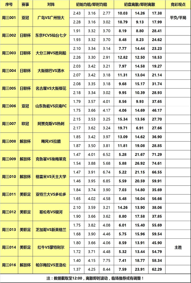 [关于离散] 竞技体育分析指数,也就是各家欧指分歧度。基本原理:百家欧指平均值与每家指数差值的绝对值的求和。离散度小则各家观点接近,进而赛果易打出;离散度大反之意见分歧大,赛果不易打出。又因各方因素影响下指数变动,离散在特殊时刻具有更高参考价值,切勿盲目参考运用。换句话说,离散只是参考指数,而非结论性数据!以下是各场数据汇总(数据截取至12:00):