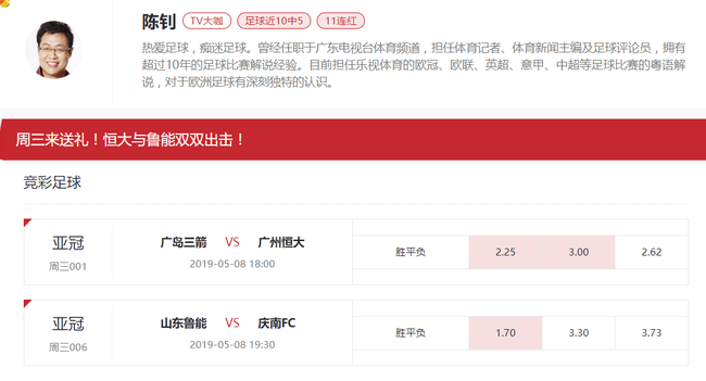 第二场:山东鲁能 VS 庆南FC。鲁能方面,目前有8分在手,虽然领先优势不大,但由于对战关系,本场保底打个0比0或者1比1就可以提前锁定出线,而庆南FC基本只有赢下鲁能这一条路可以走。鲁能在正式比赛目前拿下4连胜,意大利炮佩莱表现凶猛,连续获得进球,新赛季已经整整打进了15球。另外,李霄鹏的大胆轮换用人,也让鲁能的战斗力得以良好保持。至于庆南FC,一方面是必须要本场赢球,另外一方面则是他们在联赛遭遇连败并且被对手零封。综合第一回合的比赛数据来看,本场庆南难有赢下的机会。竞彩可单选胜,进球数可选择3、4,我推荐比分2-1、3-1。