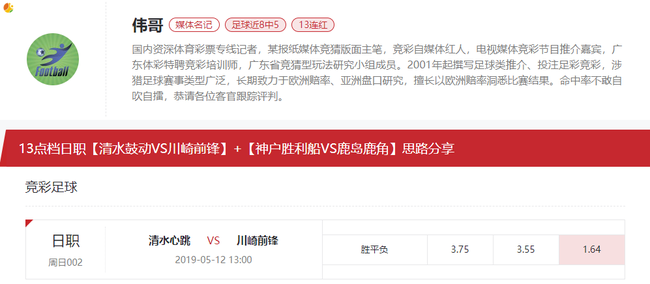 主队清水鼓动,目前积分8分,排名第16名,上一场日联杯客场3:1负大阪钢巴,近期2胜1平3负,近期表现一般,客队川崎前锋,目前积分19分,排名第4名,上一场亚冠杯主场2:2平上海上港,近期4胜2平0负,近期表现一般,综合来看,两队状态接近,本场比赛胜平负位置均有一定的关注。