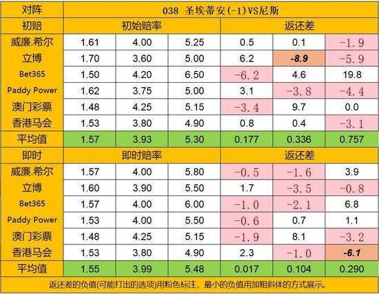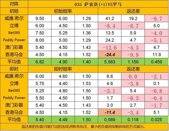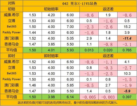 返还差原理:返还差= (博彩公司赔付率-理论赔付率)*100;结果为负数说明了理论上、博彩公司在这个选项上给的赔付率要低于理论赔付率,说明他们比较担心这个选项的打出。负数的数值越小说明该公司对+这项的打出越忌惮,该结果打出的可能较大;结果为正数说明博彩公司对该选项的打出不太担心,该结果打出的可能较小。