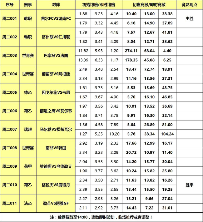 周二足坛赛事丰富,傍晚韩职2场周中赛事,晚间欧洲赛事继续,德乙、法乙和荷甲均有多场附加赛争夺,北欧瑞典超继续1场争夺;另外世青赛小组赛继续精选,今晚法国、阿根廷和葡萄牙都会出战。