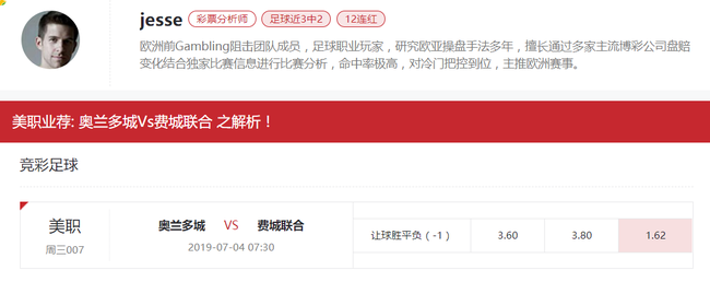 奥兰多城Vs费城联合 主队奥兰多城新赛季美职业积21分暂列排名东部第八,球队近期攻防两端表现不尽人意,近十场主场4胜2平4负,包括上轮主场0:0战平新英格兰,遭遇主场2场不胜纪录,士气稍显低落。客队费城联合新赛季美职业积32分暂列排名东部第1,球队近期攻防两端表现有所下跌,近十场客场3胜4平3负,包括上轮客场2:4不敌纽约城,遭遇客场3场不胜之颓势,士气大受打击。两队历史往绩客队费城联合占优。本赛欧指即时客胜赔率走低,这样对客队打出有利。亚指机构开出初指主让平半中水,初指优势明显,后市水位升至满水,客队热度下降,可见机构对主队信心不足,综合全部的信息,本赛看好客队不败。
