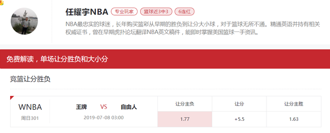 两队本赛季交手两次,都在各自的主场拿下了对手。而且两队目前都比开赛的时候,球队有了一定的进步,王牌时本着冠军而去,自由人目的时冲进季后赛,两队的实力差距还是明显的,盘口5.5分,可以接受,推荐让分主负。