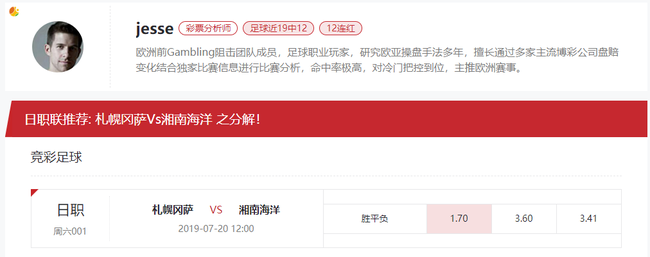 札幌冈萨Vs湘南海洋 主队札幌冈萨新赛季日职联19场积28分暂列排名第8,球队近期攻防两端表现有所下滑,上轮客场1:2不敌大分三神,主场1:1战平松本山雅,遭遇4场比赛连续不胜之颓势,士气稍显低沉。客队湘南海洋新赛季日职联积23分暂列排名第11,球队近期攻防两端表现有所回升,上轮主场3:1战胜神户胜利,客场钴2:0完胜名古屋,荣获2连胜。两队历史往绩主队占据优势。本赛欧指即时主胜赔率低下,这样对主队打出有利。亚指机构开出初指主让半一高水,初指优势明显,后市水位升高,客队热度下降,用高水阻筹对强队一方有利于打出,根据两队的实力与现状,可见机构有诱下之嫌,综合全部的信息,本赛看好主队能带走三分。
