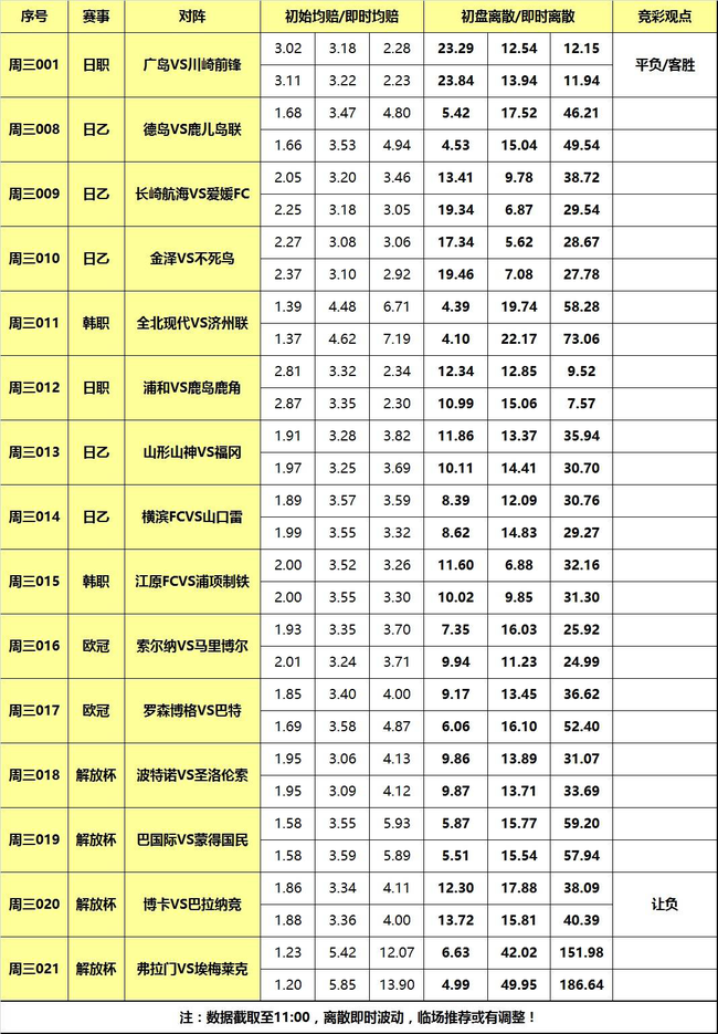 [关于离散] 竞技体育分析指数,也就是各家欧指分歧度。基本原理:百家欧指平均值与每家指数差值的绝对值的求和。离散度小则各家观点接近,进而赛果易打出;离散度大反之意见分歧大,赛果不易打出。又因各方因素影响下指数变动,离散在特殊时刻具有更高参考价值,切勿盲目参考运用。换句话说,离散只是参考指数,而非结论性数据!以下是各场数据汇总(数据截取至11:00):