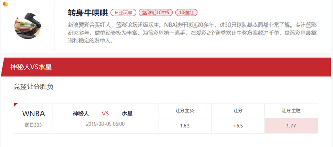 神秘人在多钴恩复出之后5连胜,多恩和托莉华的状态都很好,已经露出冠军相,但她们最近三年面对水星的时候打的都很艰难,最近10场比赛仅有一次赢了水星8分,本赛季也仅是1胜1负,水星每次遇到神秘人进攻端都能取得不错的发挥,前不久在神秘人主场虽然早早被打花,但最后一节依然能轰出一波20-10逆转了盘口,水星本赛季进攻下滑非常明显,但两次遇到神秘人得分都能在90分以上,本场在水星的主场,预计水星依然不会轻易缴械,看好水星赢盘。
