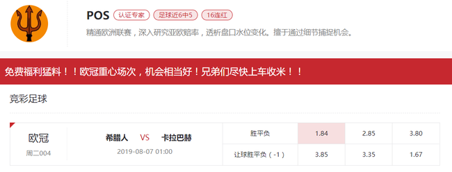 周二004 2019-8-7 1:00 欧冠 希腊人竞技vs卡拉巴赫
