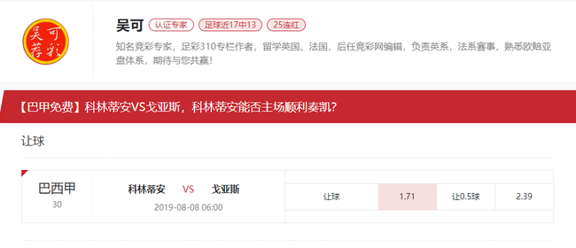 双方最近一次交手是在2015年,当时戈亚斯在客场0-3输给了科林蒂安,就双方整体的交手战绩来看,科林蒂安确实有优势,不过平局也不在少数。指数层面,个人认为还是可以的,主胜初期给到1.50左右,基本能够体现出科林蒂安在实力上的优势,最好平局这个点,平均平局这个点,后期能够普遍调整到4.00以上,这是最理想的结果,现在其实至少有半数公司已经达标,个人认为本场科林蒂安主场赢球的难度不大,主胜:2-0或3-0
