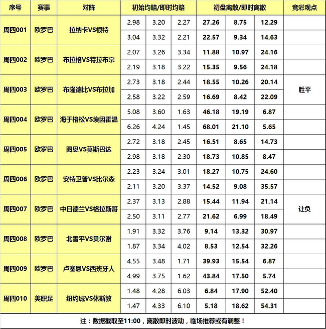 [关于离散] 竞技体育分析指数,也就是各家欧指分歧度。基本原理:百家欧指平均值与每家指数差值的绝对值的求和。离散度小则各家观点接近,进而赛果易打出;离散度大反之意见分歧大,赛果不易打出。又因各方因素影响下指数变动,离散在特殊时刻具有更高参考价值,切勿盲目参考运用。换句话说,离散只是参考指数,而非结论性数据!以下是各场数据汇总(数据截取至11:00):