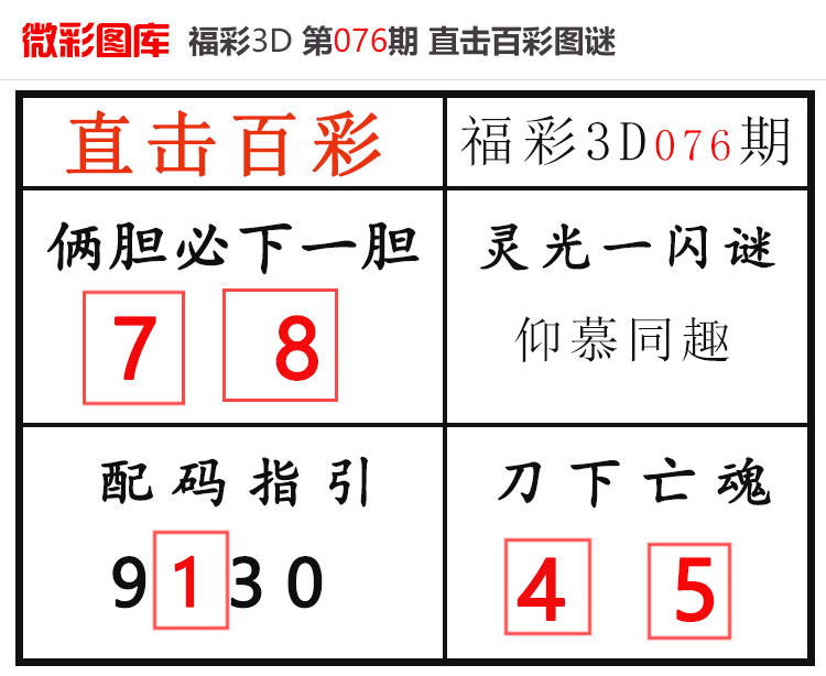 25076期:福彩3D【直击百彩】微彩图谜 开781 胆码红7、8、配码红1、杀码准