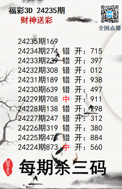 上一篇:福彩3D24235期分析师小鲨鱼杀号图精选