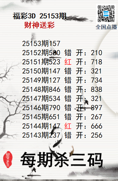 上一篇:福彩3D25153期分析师小鲨鱼杀号图精选