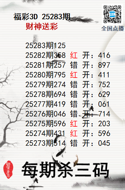 上一篇:福彩3D25283期分析师小鲨鱼杀号图精选