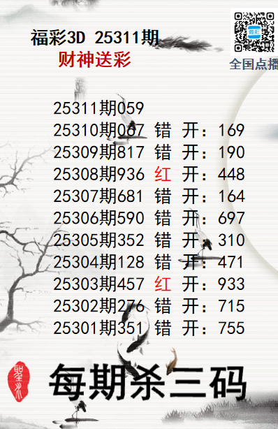 上一篇:福彩3D25311期分析师小鲨鱼杀号图精选