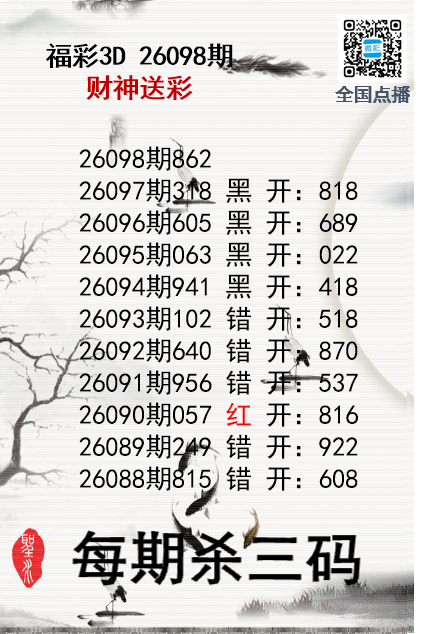 上一篇:福彩3D26098期分析师小鲨鱼杀号图精选